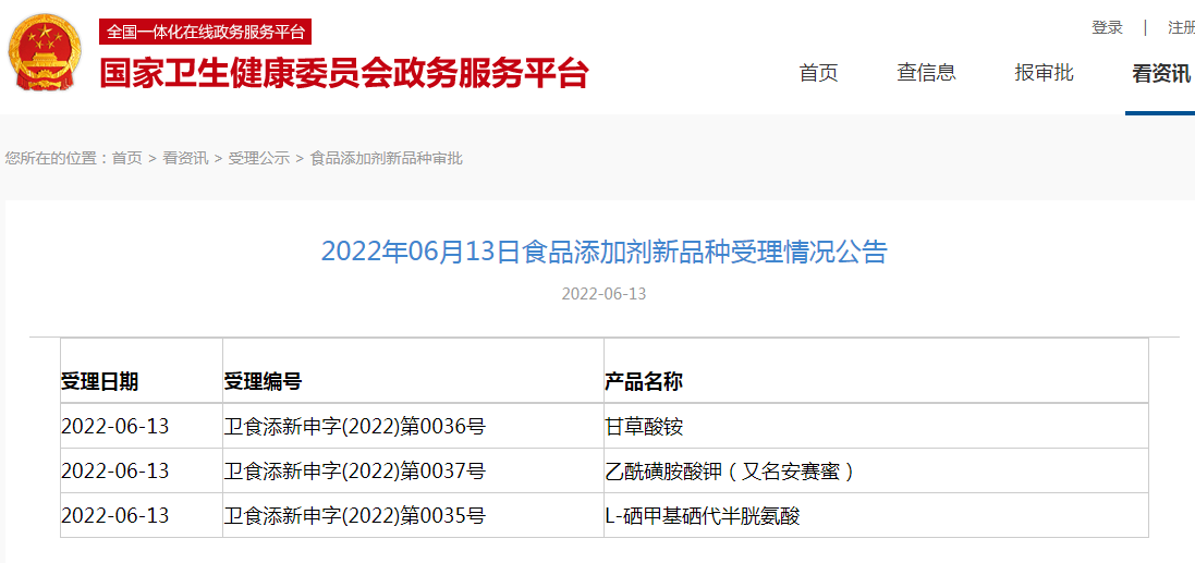 2022年06月13日食品添加劑新品種受理情況公告